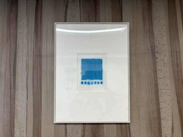 水色を基調とした版画は、やさしく癒しを感じさせる雰囲気がある一方、